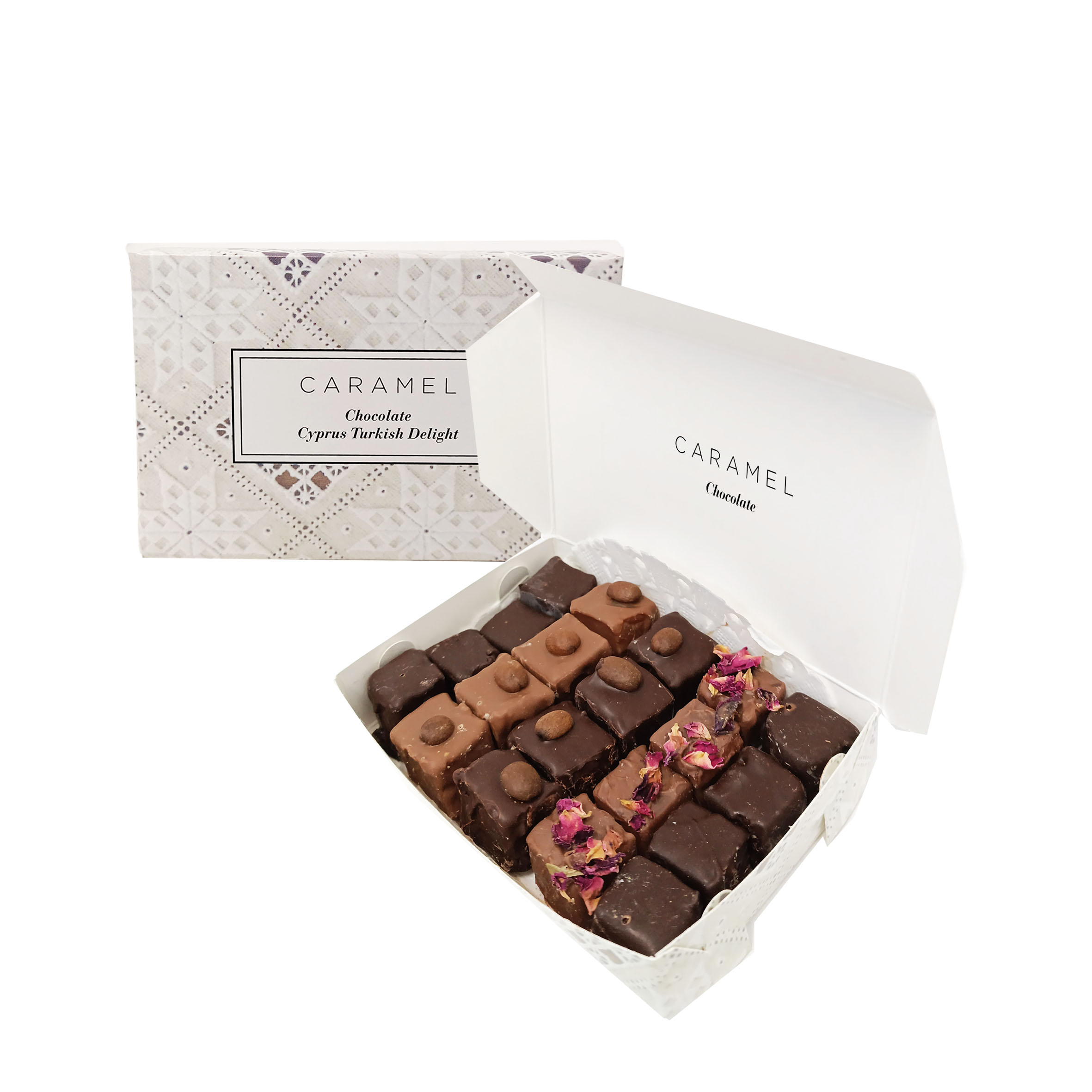 Küçük Boy Kutu ölçü : 12cm x 8cm Güllü ,Gül Yapraklı Lokum, Antep Fıstıklı, Kahveli –Sütlü/Bitter